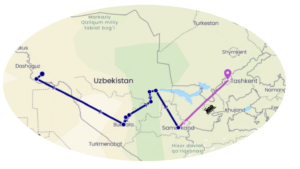 Quittant l’oasis du Khorezm, la route longe en partie le cours de l’Amou-Darya et traverse les étendues sablonneuses du Kizil-Koum (Sables Rouges) pour atteindre enfin les plaines cotonnières gagnées sur le désert par irrigation au moyen des eaux de la mer d’Aral.