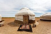 Les campements de yourtes sont situés à une dizaine de km de la rive ouest du lac Aïdarkul. Chaque campement se compose de 20 yourtes décorées de tapis faits main et est équipé de 8 cabines de toilettes et de 8 cabines de douches (à part), ainsi que d’une Yourte restaurant.